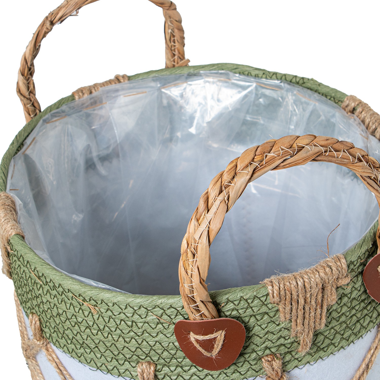 Set 3 Cestos Mimbre Natural/verde Tela Blanca C/flecos Ø33x43+ø30x37+ø24x31cm